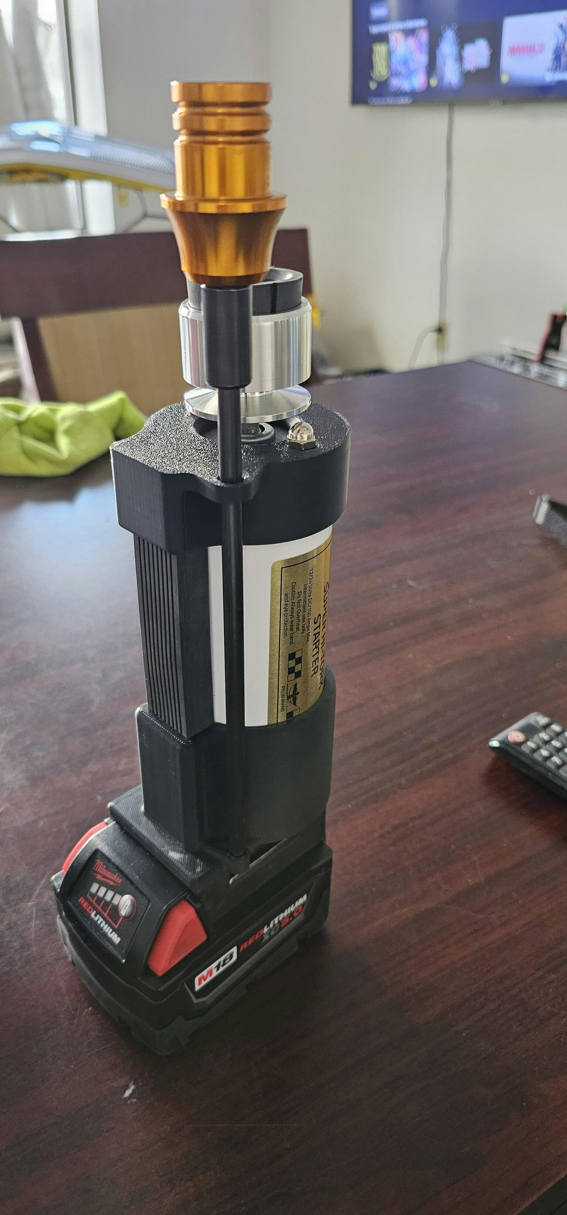 This 3D printed adapter mounts to the Dynatron motor and provides an easy way to use your M18 batteries for a convenient starter setup. It balances well in the hand and doesn't add a ton of bulk to your starter (depending on the battery size you use). Comes partially assembled and pre-wired. Wago 221-412 wire splicing terminals make it easy to connect your Dynatron's input leads to the adapter and get flying with no soldering required.