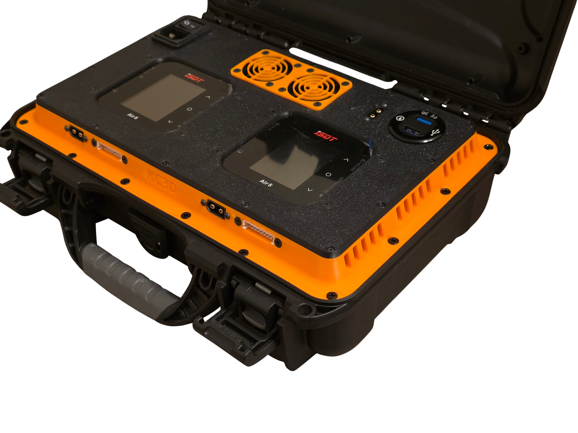 We pack as much power as we reasonably can into our charge cases. By utilizing the interior lid space with a unique 3D printed riser-style deck instead of having a simple flat panel deck, we can squeeze bigger power supplies and bigger chargers into our cases. The main tradeoff is the lack of storage space - you will need to find somewhere else to put your power cord and charge leads. For most people, this is only a mild tradeoff, as we already bring other tool/field boxes to the field anyway.